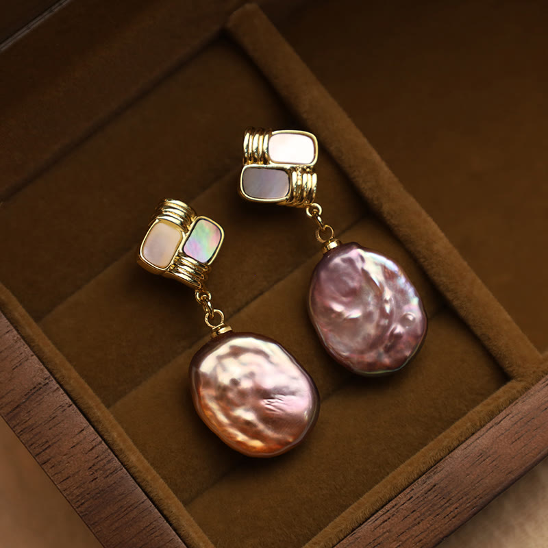 KarmaRipple's 925 Sterling Silver Posts Bronze Plated Gold Authentic Baroque Pearl Balancing Drop Earrings -