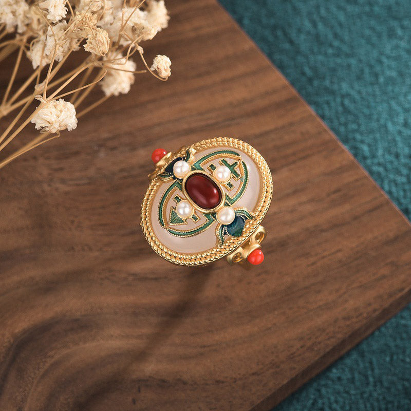 KarmaRipple's Ivory Jade Red Agate Happiness Fortune Ring -