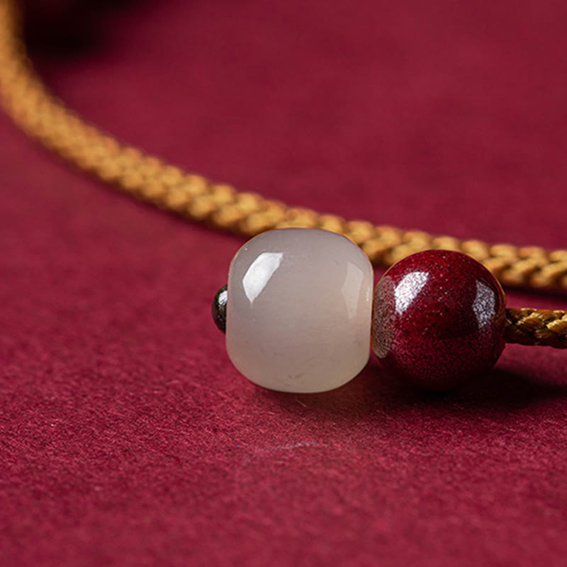- Taille des perles : cinabre 6 mm, jade blanc 6 x 7 mm