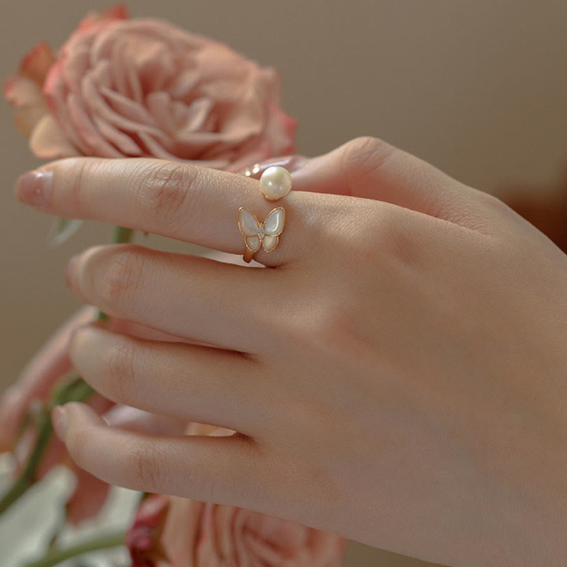KarmaRipple's 14K Gold Plated Bronze Pearl Tridacna Stone Butterfly Blessing Ring Bracelet Pendant Necklace Earrings Set