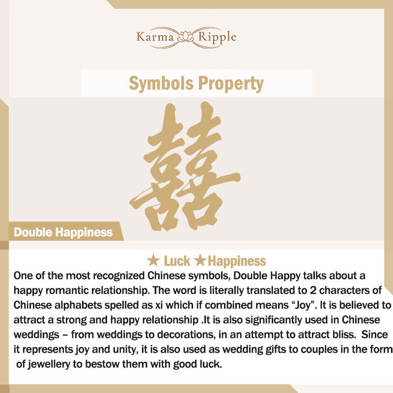 One of the most recognized Chinese symbols, Double Happy talks about a happy romantic relationship. The word is literally translated to 2 characters of Chinese alphabets spelled as xi which if combined means "Joy". It is believed to attract a strong and happy relationship .It is also significantly used in Chinese weddings – from weddings to decorations, in an attempt to attract bliss. Since it represents joy and unity, it is also used as wedding gifts to couples in the forms of jewellery to bestow them with good luck.