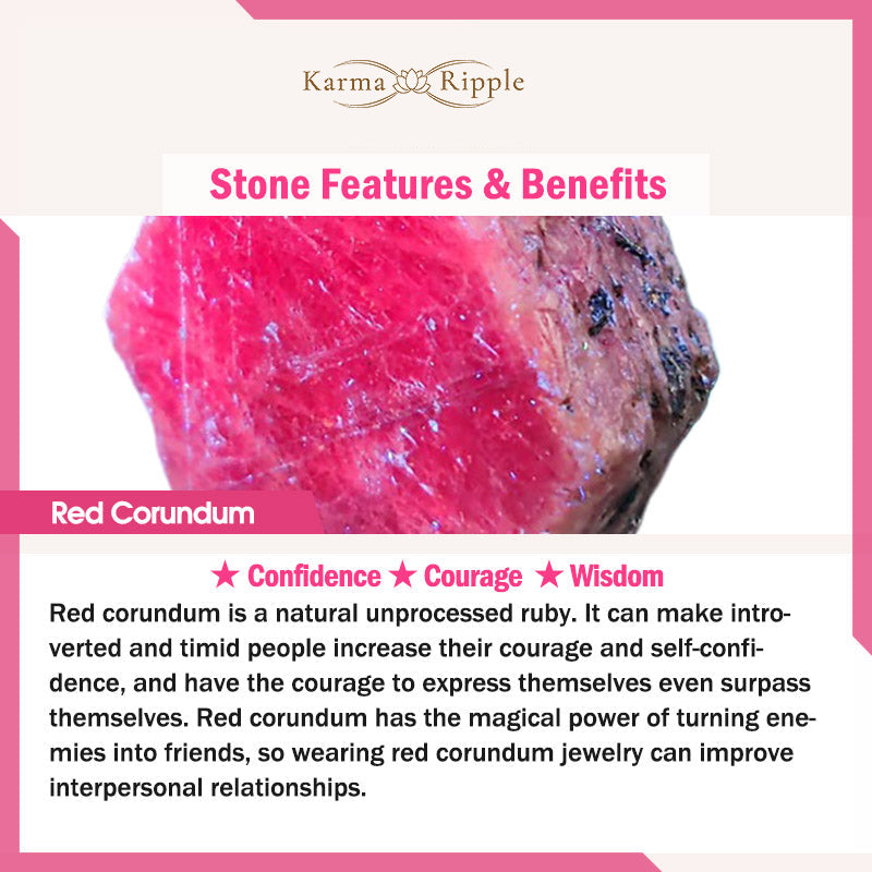 Red corundum is a natural unprocessed ruby. It can make introverted and timid people increase their courage and self-confidence, and have the courage to express themselves even surpass themselves. Red corundum has the magical power of turning enemies into friends, so wearing red corundum jewelry can improve interpersonal relationships.