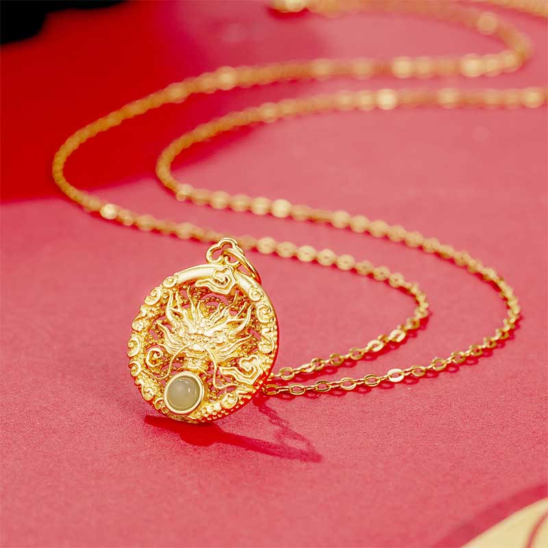 KarmaRipple's 925 Sterling Silver Year Of The Dragon Round Authentic Hetian Jade Inlaid Strength Pendant Necklace