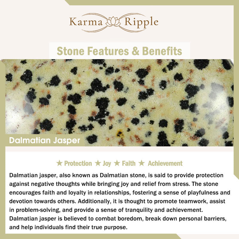 Dalmatian jasper, also known as Dalmatian stone, is said to provide protection against negative thoughts while bringing joy and relief from stress. The stone encourages faith and loyalty in relationships, fostering a sense of playfulness and devotion towards others. Additionally, it is thought to promote teamwork, assist in problem-solving, and provide a sense of tranquility and achievement. Dalmatian jasper is believed to combat boredom, break down personal barriers, and help individuals find their true purpose.