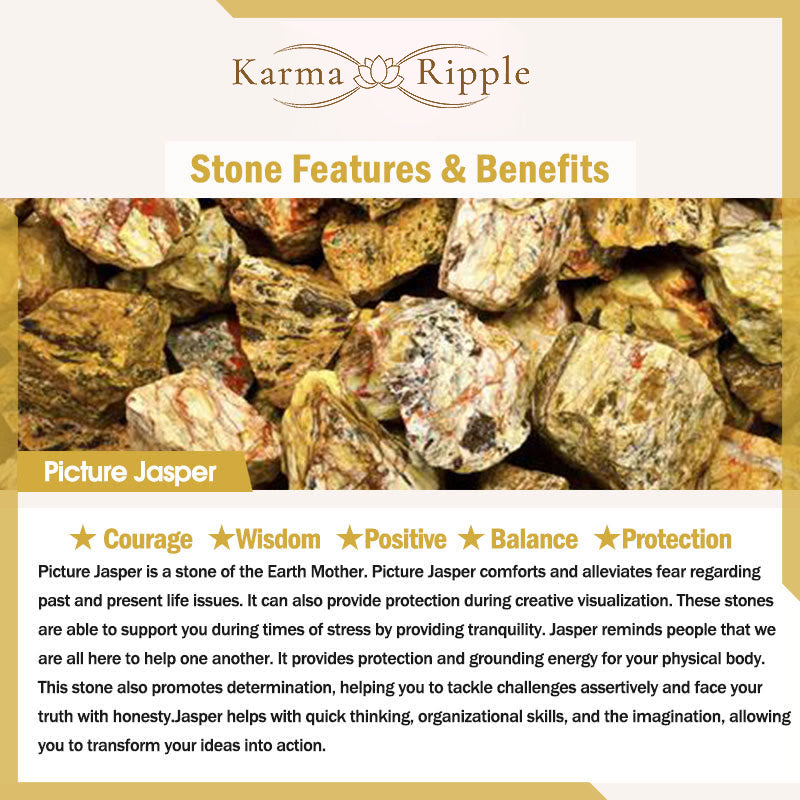 Picture Jasper is a stone of the Earth Mother. Picture Jasper comforts and alleviates fear regarding past and present life issues. It can also provide protection during creative visualization. These stones are able to support you during times of stress by providing tranquility. Jasper reminds people that we are all here to help one another. It provides protection and grounding energy for your physical body. This stone also promotes determination, helping you to tackle challenges assertively and face your truth with honesty.