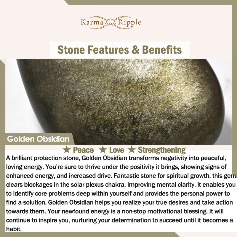 Gold obsidian is a kind of obsidian that contains a bright golden substance. Obsidian is considered to have the effect of resisting, absorbing negative energy and protecting the body, and is often used in divination calculations and predicting the future. The effect of gold sheen obsidian is stronger than obsidian, it can enhance vitality, restore people's spirit, and can also dissolve negative energy.