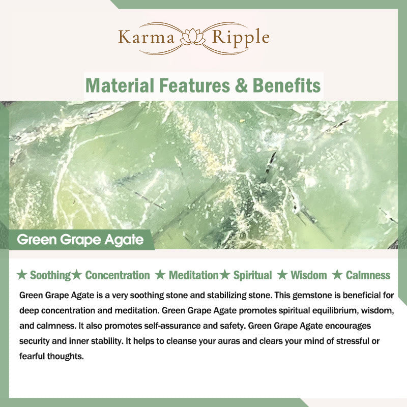Green Grape Agate is a very soothing stone and stabilizing stone. This gemstone is beneficial for deep concentration and meditation. Green Grape Agate promotes spiritual equilibrium, wisdom, and calmness. It also promotes self-assurance and safety. Green Grape Agate encourages security and inner stability. It helps to cleanse your auras and clears your mind of stressful or fearful thoughts.
