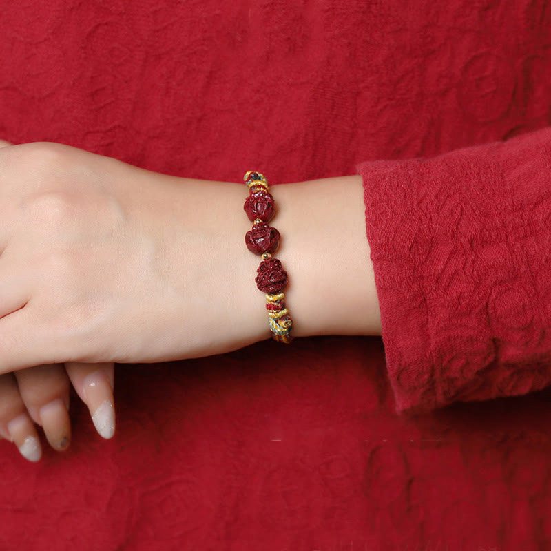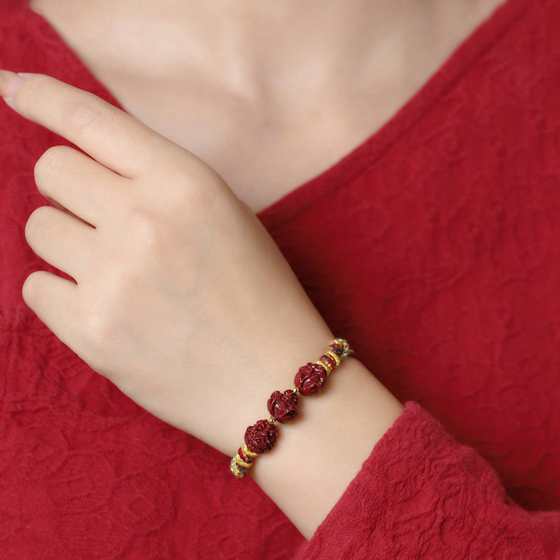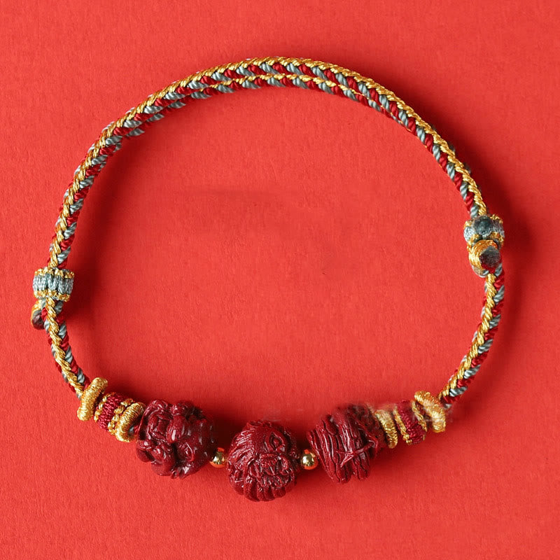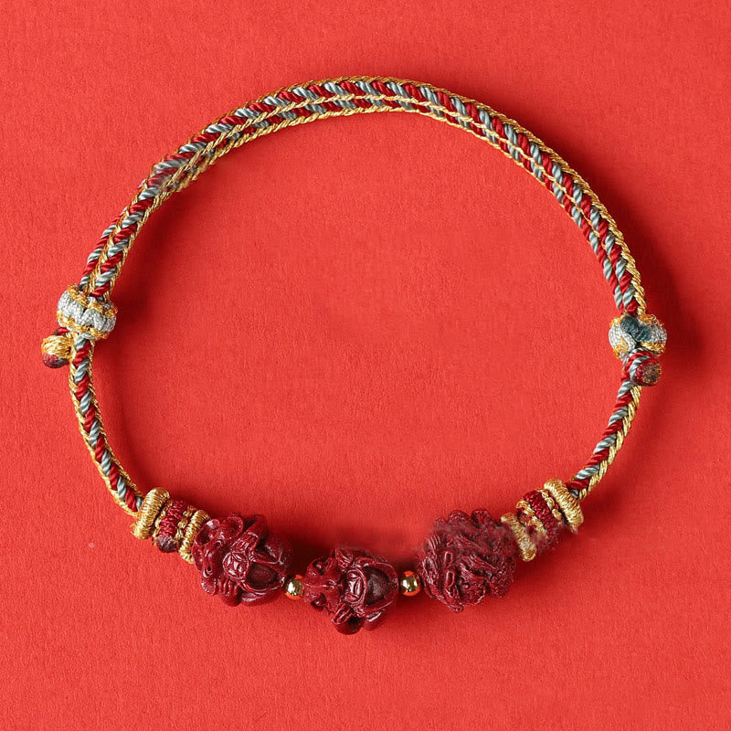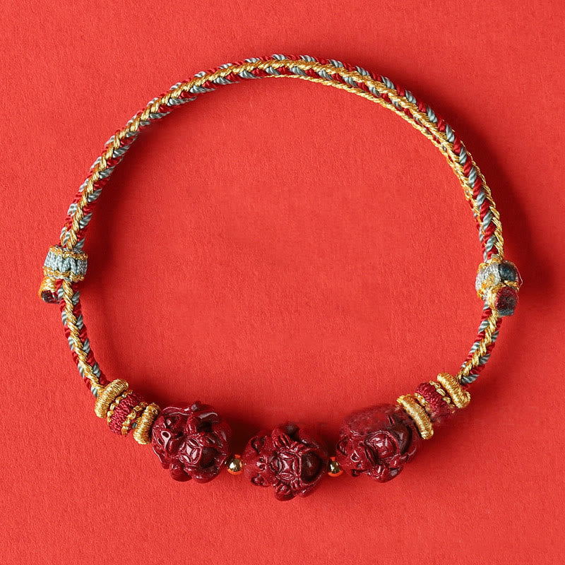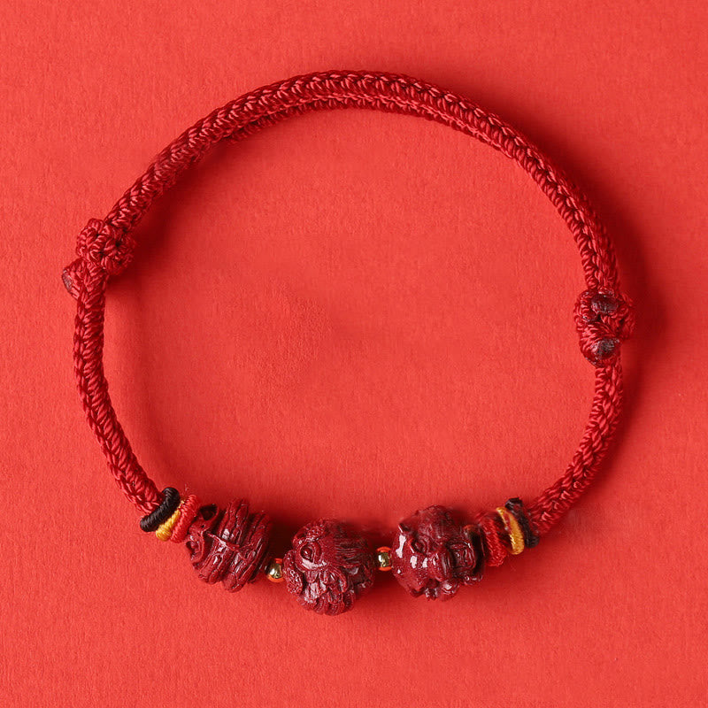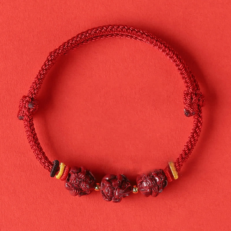 Cinnabar Blessing Bracelet features three cinnabar beads carved with Chinese zodiac animals on a braided red string. Each design represents blessings, protection, and connection to zodiac energy. Choose from various zodiac options for a meaningful and personalized talisman to align with your spiritual journey and invite good fortune into your life.