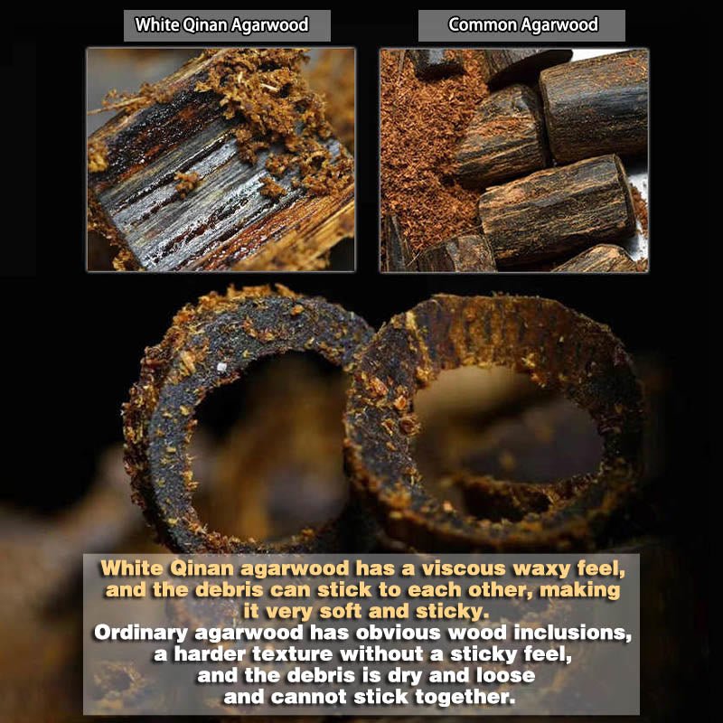 Ordinary agarwood has obvious wood inclusions, a harder texture without a sticky feel, and the debris is dry and loose and cannot stick together. -