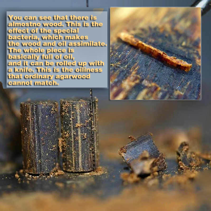 The precious white agarwood raw material has almost no wood content. This is the result of special bacteria that assimilate the wood and oil. The whole piece is basically full of oil, and it can be rolled up when cut with a knife. This is a oil property that ordinary agarwood cannot match.